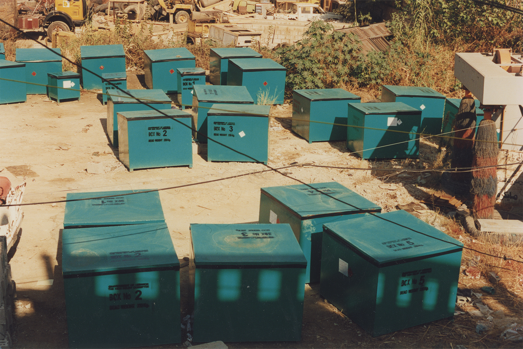 Containers of toxic waste barrels kept on an empty plot of land in Antelias, close to the highway and amidst residential and commercial buildings.