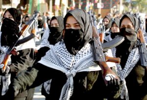 متطوّعات في “جيش القدس” خلال عرض عسكري في بغداد للتعبير عن استعدادهم للتصدي للهجوم الاميركي المحتمل على العراق 31 تموز 2001- مصدر: أرشيف جريدة السفير